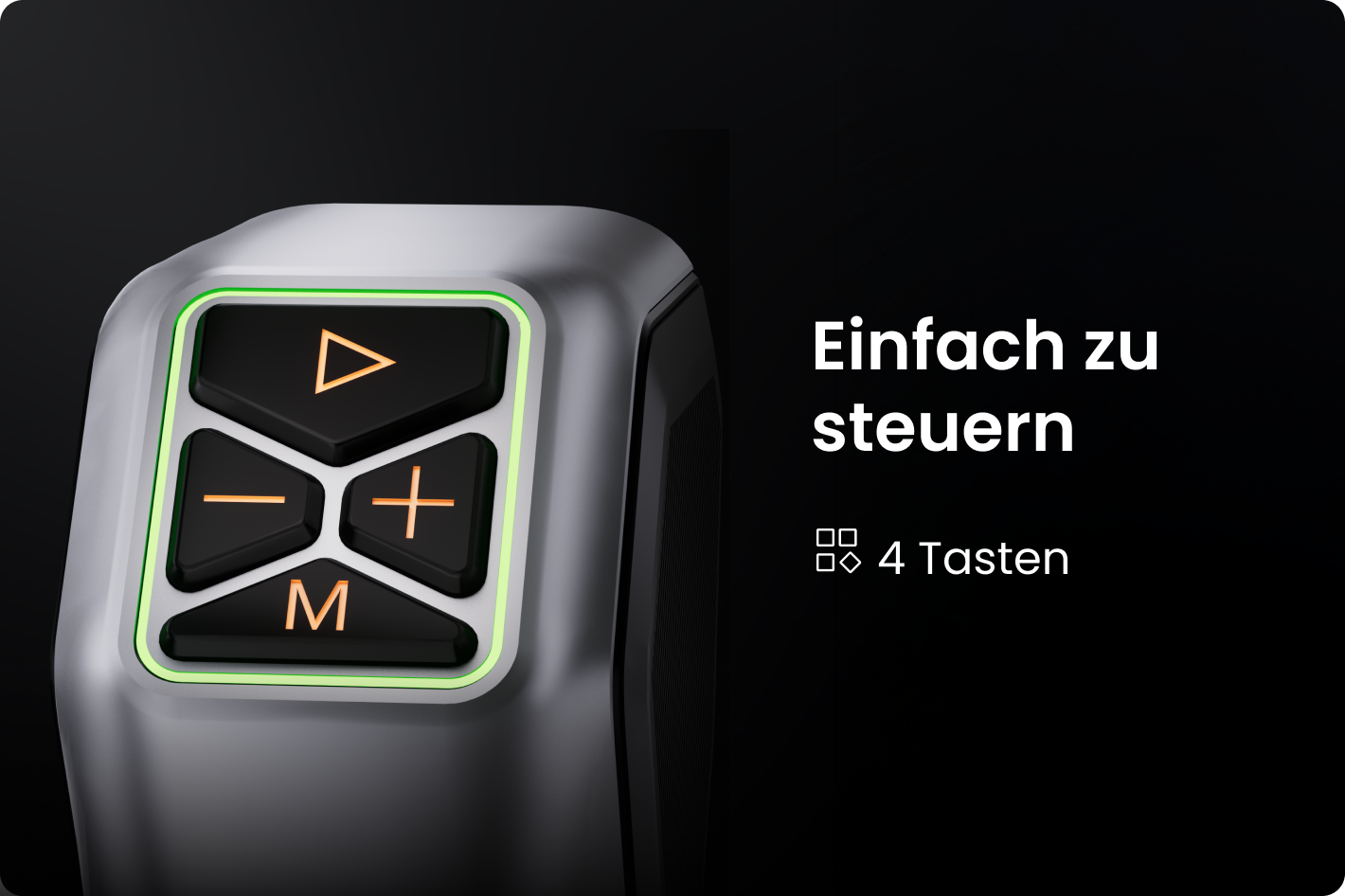 Steuern Sie Ihre Scans mühelos: Starten/Pausieren, Belichtung der Tiefenkamera anpassen und digital zoomen – alles per Knopfdruck über das 4-Tasten-Bedienfeld.