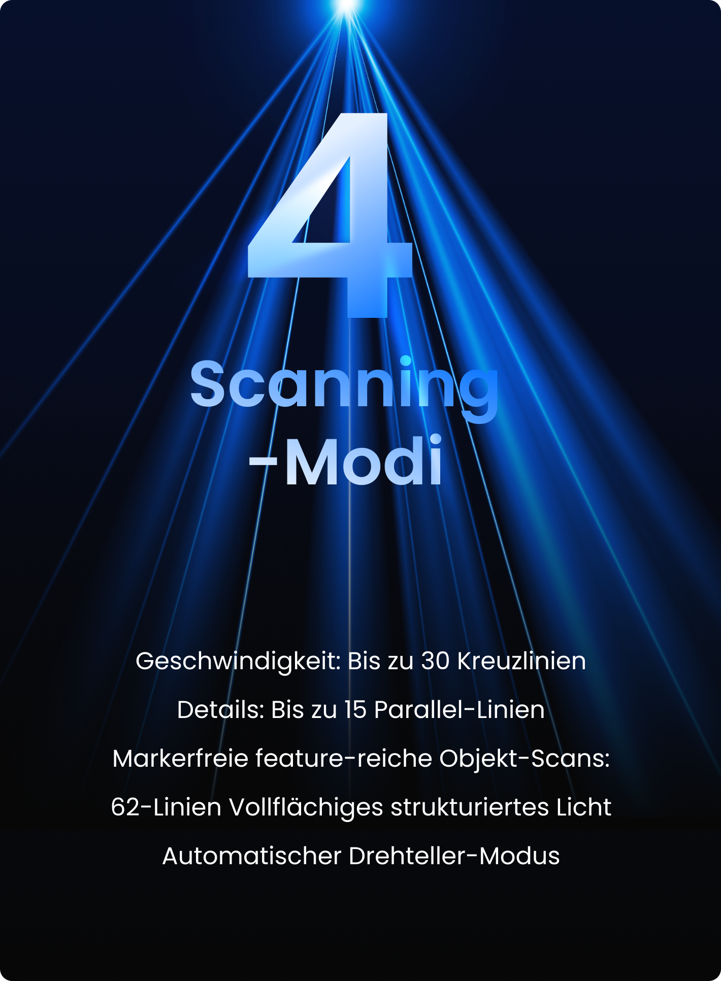 Verbessern Sie die Klarheit Ihrer 3D-Modelle, indem Sie sicherstellen, dass jedes feine Detail, jede Kante und jede komplexe Oberfläche präzise erfasst wird, mithilfe der 7 leistungsstarken parallelen blauen Laserlinien.