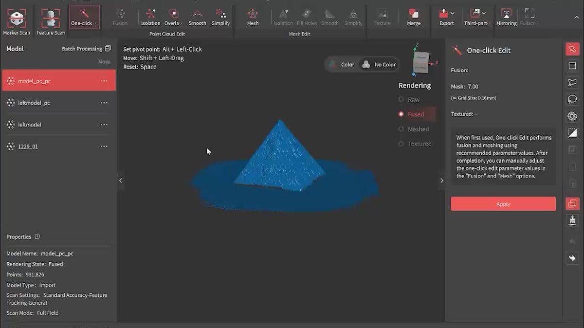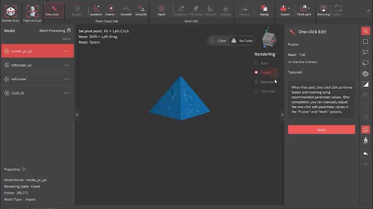 Sie können den einstellbaren Ein-Klick-Bearbeitungsmodus verwenden, um den Scan automatisch zu verarbeiten oder dies manuell zu tun, mit vollem Zugriff auf die Optionen für Keyframe-Bearbeitung, Fusion, Meshen und Texturierung.