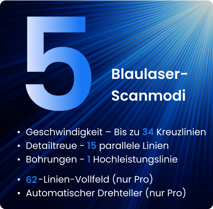 Verwalten Sie komplexe Geometrien und Oberflächen effizient mit den 5 Scan-Modi des MetroY Pro. Seine fortschrittliche blaue Laserlinienmatrix unterstützt die Modi Überkreuzlinien, Parallellinien und Einzel-Laserlinie, während sein blauer Lichtprojektor schnelle Scans im manuellen Modus (Vollfeld) und einen ultra-detaillierten automatischen Drehteller-Modus ermöglicht.