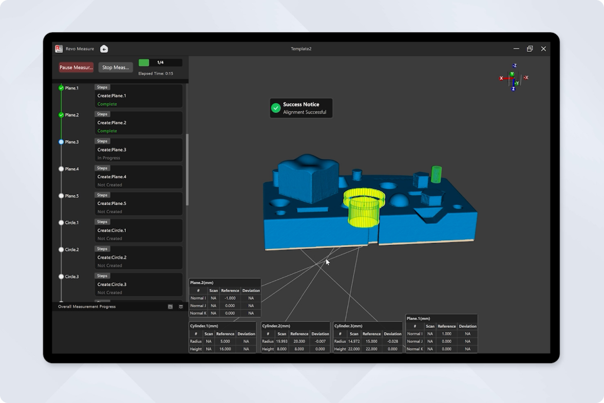 Revo Measure is professional 3D metrology software that evaluates shape, dimensions, and quality by comparing point cloud or mesh data to CAD models or drawings. Seamless one-click integration with Revo Scan ensures a smooth and efficient quality control workflow.
