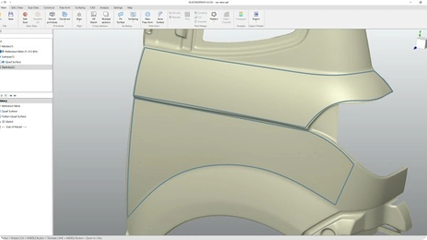 Draw freeform curves on the reference mesh to create blended curves, filled surfaces, free forms from 3D sketches, or other surface manipulations. You can also generate bounded surfaces from 3D sketches for better reference data.