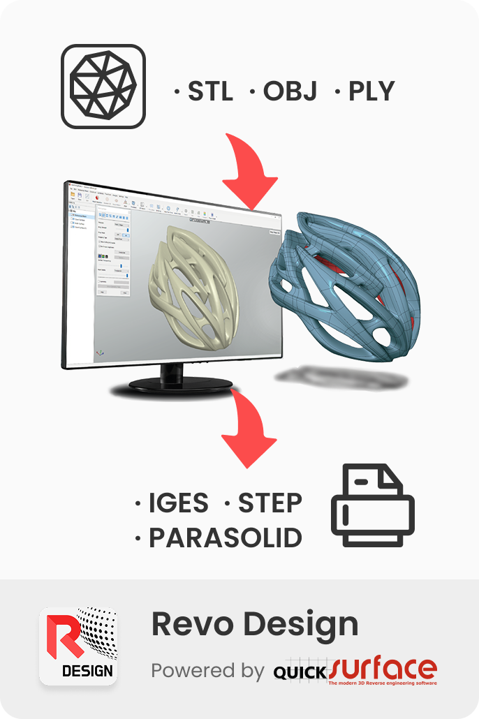 Import scan data into Revo Design as STL, OBJ, or PLY mesh files. Revo Design supports meshes of any size and includes simple, intuitive tools for mesh editing.