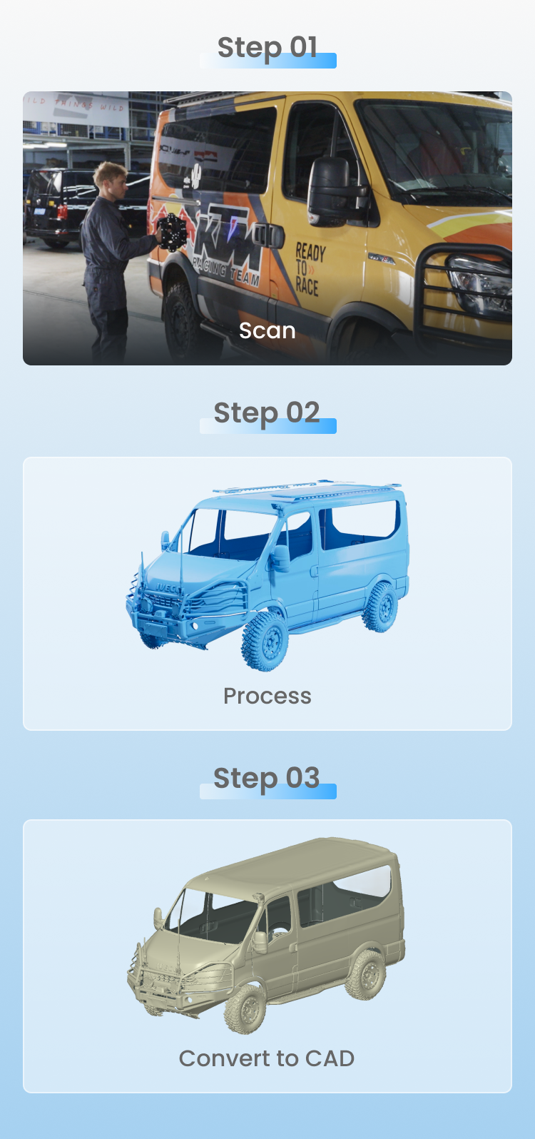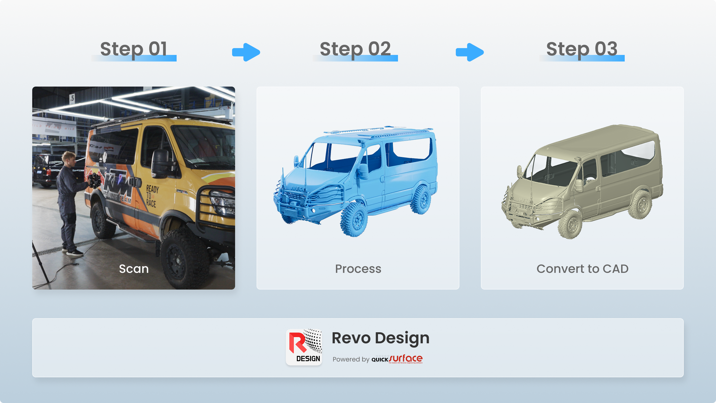 Revo Scan and Revo Scan 5 MetroX offer a quick link to Revo Design, enabling seamless object scanning, point cloud generation, and CAD editing.